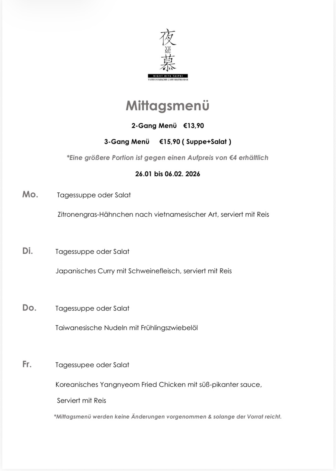 Willkommen im Ye Mu Night Bite Taipei Ye Mu Night Bite Taipei Taipei in Lustenau! Wir freuen uns auf Ihren Besuch. Lassen Sie sich von unserer köstlichen Auswahl an asiatischen Gerichten verzaubern. Genießen Sie fantastische hausgemachte und traditionelle Speisen, serviert von unserem freundlichen Personal. Verbringen Sie Ihr Mittag- oder Abendessen in unserem stilvollen Restaurant. Tauchen Sie ein in die authentische asiatische Küche! Bestellen Sie unsere leckeren Gerichte bequem zu Hause oder bestellen Sie zum Mitnehmen. Bei uns profitieren Sie von unserem Außenservice, Parkplätzen und kostenlosem WLAN. Wir bieten Ihnen eine gute Erreichbarkeit für alle unsere Gäste. Sie können bei uns mit verschiedenen Zahlungsmethoden bezahlen. Reservieren Sie noch heute Ihren Tisch!